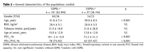 Table 2 presents the general characteristics of the groups with and without COPD. Females predominated in both groups of smokers, those with COPD (59% female) and those without (64% female). The mean age was higher in the group of smokers with COPD. Body mass index (BMI), age at smoking onset, and tobacco intake were similar between the two groups. As expected, smokers with COPD presented lower FEV1 and FEV1/FVC values.