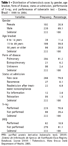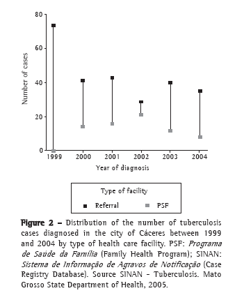 This was a descriptive epidemiological study based on the registry of TB cases diagnosed and treated in the city of Cáceres, Brazil. All cases reported between 1999 and 2004 were included in the study. This period was chosen based on the fact that records for TB cases were entered into the Sistema de Informação de Agravos de Notificação (SINAN, Case Registry Database) of the Mato Grosso State Department of Health beginning in 1999. Through the identification code of the health care clinics and oral guidance provided by technicians from the Cáceres Regional Health Department, it was possible to identify which records referred to cases treated at family health care clinics.