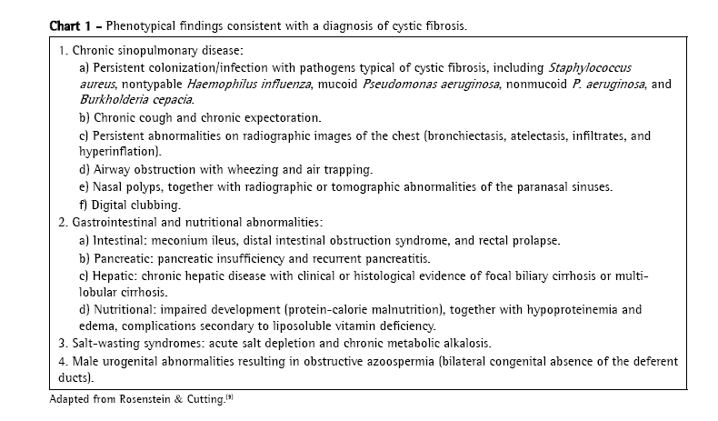 Table 1 shows the diagnostic criteria for CF. To be diagnosed with CF, an individual must present at leastonephenotypicalfinding(Chart1),haveafamily history of CF, or screen positive for CF in neonatal testing, as well as presenting laboratorial evidence of CFTR dysfunction - positive sweat test or positive nasal potential difference (NPD) - or have the two CFTR gene mutations known to cause CF.(5,9)