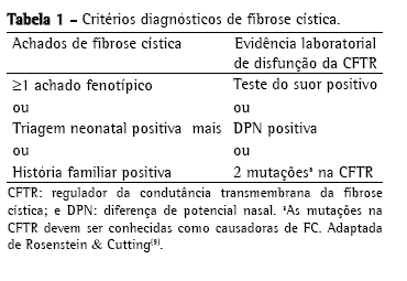 A Tabela 1 apresenta os critérios diagnósticos de FC. A FC é diagnosticada pela presença de pelo menos um achado fenotípico (Quadro 1), história familiar de FC ou triagem neonatal positiva, acompanhada de evidência laboratorial de disfunção da CFTR -teste do suor positivo ou diferença de potencial nasal (DPN) positivo -ou pela identificação de duas mutações conhecidas como causa de FC nos genes da CFTR).(5,9)