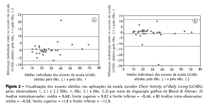 Na análise da reprodutibilidade interobservador obteve-se um alfa de Cronbach (α) de 0,97 (IC95%: 0,89-0,97; p < 0,01) para o escore total da escala LCADL, sendo que, em 13 das 15 questões, o CCI foi superior a 0,90 (p < 0,01), na questão 12, referente à dispnéia durante o movimento de curvar-se, o CCI foi de 0,85 (p < 0,01) e na questão 15, referente a falar/conversar, o CCI foi de 0,67 (p < 0,05). A Figura 1 mostra a representação gráfica da reprodutibilidade interobservador.