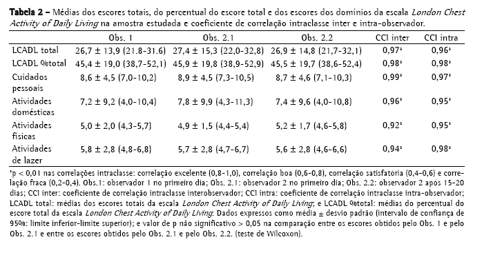 Também se encontrou excelente reprodutibilidade inter e intra-observador para o percentual do escore total da escala LCADL, sendo o CCI, respectivamente, 0,97 e 0,98 (p < 0,01). Ao se correlacionar o escore total com o percentual do escore total, encontrou-se um r = 0,87 (p < 0,05).