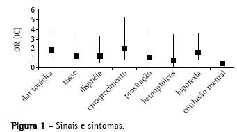 Percebe-se que não houve predomínio de nenhum sinal ou sintoma clínico, nem de achados auscultatórios e nem de prevalência de co-morbidades entre os grupos. Embora o odds ratio mostre alguma associação mais forte em certas variáveis (emagrecimento e confusão mental, por exemplo), os dados não demonstraram significância estatística (Tabela 2 e Figura 1).