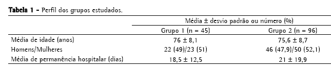 Quarenta e cinco pacientes (31,9%) apresentaram radiografias compatíveis com a suspeita clínica de PNM e formaram o Grupo 1. A média de idade deste grupo foi de 76 anos (desvio padrão 8,1 anos) e a média de permanência hospitalar foi de 18,5 dias (desvio padrão 12,5). Neste grupo de pacientes havia 23 mulheres (51%) e 22 homens (49%) (Tabela 1).