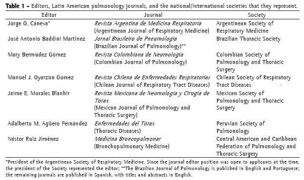 In order to analyze the current status of journals dealing with respiratory tract diseases and published in Latin America, the editors of seven such journals (Table 1) were summoned to a meeting organized by the Asociación Latinoamericana de Tórax (ALAT, Latin American Thoracic Society) in Lima, Peru, on February 4, 2007. All of the journal editors presented reports on the editorial status of their respective journals (Table 2). The reports presented by the editors were complemented by the responses to a survey on how to increase the number and quality of the manuscripts published. According to the editors, improving information acquisition is the main motivation for national respiratory medicine societies to edit their own journals. In addition, they consider disseminating medical knowledge and reporting experiences to be the main motivations for authors to publish manuscripts. However, the most common failing in the manuscripts submitted is poor compliance with the journal guidelines and requirements. The strategy most commonly used by editors to improve the quality of manuscripts is improving author-editor-reviewer relationships. Of the seven editors, three reported a decrease in the number of original manuscripts submitted to their journals. This decrease was mainly attributed to increasing pressure to publish in journals with the highest impact factor. The suggestions for improving Latin American journals dealing with respiratory tract diseases can be summarized as follows: to increase the level of professionalism in the editorial aspects; to encourage manuscript reviewers to be more detail-oriented; and to strictly adhere to international norms for editing medical journals.(1)