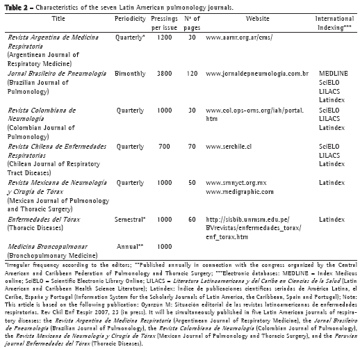 We believe that the seven journals evaluated constitute a highly representative sample in terms of the processes involved in the publishing of pulmonology journals, which are official organs of national and regional respiratory medicine societies in Latin America. In addition, according to an online (Internet) bibliographic search,(2) such journals account for 77.77% of the new pulmonology journals published in Latin America.