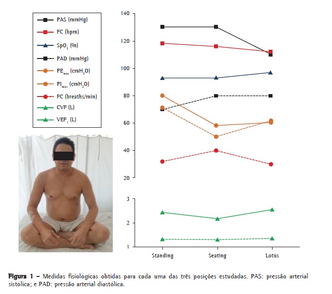 Como pode ser visto na Figura 1, a posição de lótus aparentemente trouxe várias vantagens quando comparada à posição em pé, aumentando a SpO2 (93% vs. 97%) e diminuindo a FC (118 bpm vs. 112 bpm), assim como aumentando a pressão arterial diastólica e reduzindo a pressão arterial sistólica (130/70 mmHg vs. 110/80 mmHg). Além disso, PImáx e PEmáx, medidas pela boca, foram menores quando o paciente assumia a posição de lótus do que quando em pé, embora os valores de VEF1 e FR continuaram semelhantes (1,35 L vs. 1,38 L e 32 ciclos/min vs. 30 ciclos/min, respectivamente). Ainda, a CVF foi maior com a posição de lótus do que com o paciente sentado (2,57 L vs. 2,45 L).