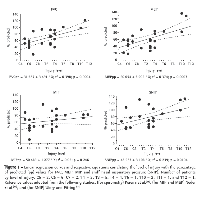 Our findings show that SNIP is positively and significantly correlated with the level of injury. The spectrum of disturbance observed through FVC measurement was paralleled by that observed through SNIP determination, lower values for both parameters being obtained in tetraplegic patients. Neither MEP nor MIP was sensitive enough to differentiate tetraplegic patients from those with thoracic medullar injuries, and MIP failed to present any significant correlation with the exact level of injury.