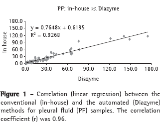Pulmonology societies, including the Sociedade Brasileira de Pneumologia e Tisiologia (SBPT, Brazilian Thoracic Association),(20) recommend the determination of ADA activity in organic fluids, especially in PF and CSF.(21) Therefore, the standardization of reliable automated methods is needed in order to define the diagnosis more rapidly and favor TB treatment.