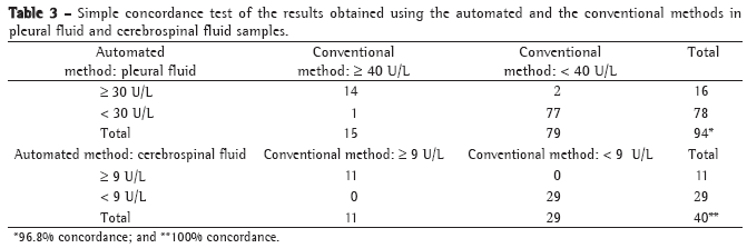 Table 3 presents the results of the simple concordance test. Considering the cut-off values of 40 U/L (conventional method) and 30 U/L (automated method) for the detection of pleural TB in PF samples, the concordance was 96.8%. For the detection of meningeal TB in CSF samples, the cut-off value was 9 U/L (for both methods), and the concordance was 100%.