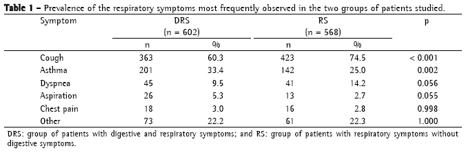 Between January of 1995 and December of 2005, we conducted 4,020 esophageal manometry tests and 3,486 pH-metry tests. For this study, 1,170 patients met the inclusion criteria. Of those, 568 (48.5%) presented respiratory symptoms without digestive symptoms (RS group), whereas 602 (51.5%) reported digestive symptoms associated with respiratory symptoms (DRS group). Of the 309 male patients, 152 (26.4%) were in the RS group and 157 (26.8%) were in the DRS group. Of the 861 (73.6%) female patients, 416 (73.2%) were in the RS group and 445 (73.9%) were in the DRS group. The distribution by gender was homogeneous between the two groups. The clinical symptoms that led the patients to be referred for functional evaluation of the esophagus are described in Table 1. Cough and asthma were the most common respiratory symptoms among the patients in both groups. Other symptoms included recurrent pneumonia, lung abscess, bronchiectasis, chronic obstructive pulmonary disease, pulmonary fibrosis, and sleep apnea.
