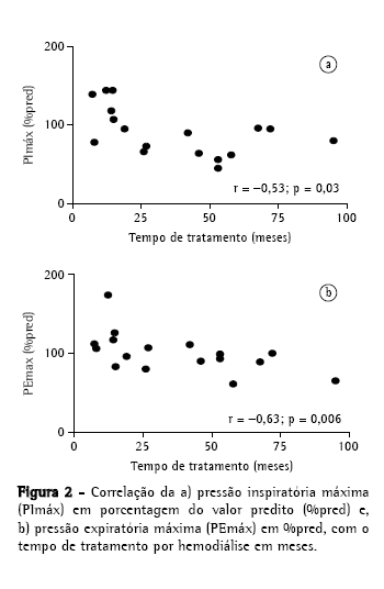 O tempo de tratamento por hemodiálise correlacionou-se negativamente e significativamente com a PImáx (r = −0,53; p = 0,03) e PEmáx (r = −0,63; p = 0,006), analisadas em termos de porcentagem dos valores preditos, conforme mostra a Figura 2. Não houve correlação significativa do tempo de tratamento com as variáveis espirométricas analisadas (−0,42 < r < 0.16; p > 0,05 para todas) e com a idade (r = 0.27; p = 0,30).