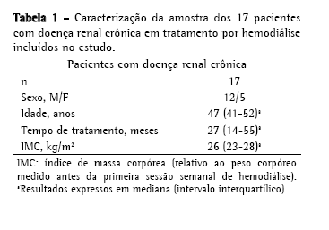 Participaram do estudo, por uma amostra de conveniência, 17 pacientes com DRC. As características da amostra estudada são mostradas na Tabela 1. Além do diagnóstico de DRC, outros critérios de inclusão foram a ausência de doença respiratória crônica, cérebro-vascular e/ou reumática de acordo com a história relatada pelo paciente em entrevista inicial realizada antes das avaliações. Os critérios de exclusão foram instabilidade hemodinâmica no dia da avaliação; presença de alterações cardíacas severas de acordo com avaliação eletrocardiográfica recente constante no prontuário; e não-colaboração com os testes. Os pacientes realizavam tratamento de hemodiálise três vezes por semana em um serviço de hemodiálise na cidade de Londrina (PR). As sessões de hemodiálise dos pacientes estudados eram realizadas às segundas, quartas e sextas-feiras ou às terças, quintas e sábados, sendo em ambos os casos chamadas de 1ª, 2ª e 3ª sessões, respectivamente. Portanto, antes da 1ª sessão semanal de hemodiálise houve um período interdialítico de três dias, enquanto que nas outras duas sessões semanais o período interdialítico foi de dois dias. O estudo foi aprovado pelo Comitê de Ética em Pesquisa em Seres Humanos da Universidade Estadual de Londrina - Hospital Universitário. Os pacientes consentiram formalmente com os procedimentos do estudo ao assinarem o termo de compromisso esclarecido antes de sua inclusão.