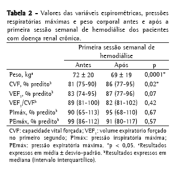 Objetivo: Avaliar a função pulmonar e a força muscular respiratória de pacientes com doença renal crônica e correlacioná-las com a variação de peso ligada à realização de hemodiálise; estudar a correlação entre o tempo de hemodiálise e possíveis alterações respiratórias. Métodos: Foram avaliados 17 pacientes (mediana de idade, 47 anos; intervalo interquartílico, 41-52 anos) submetidos a três sessões semanais de hemodiálise (mediana de tempo, 27 meses; intervalo interquartílico, 14-55). Doze eram do sexo masculino. Realizaram espirometria e mensuração das pressões máximas inspiratória (PImáx) e expiratória (PEmáx) antes e após a primeira sessão semanal de hemodiálise. O peso corporal foi quantificado antes e após as três sessões semanais. Resultados: Oito pacientes apresentaram distúrbio restritivo leve antes da primeira sessão de hemodiálise. Desses, 2 normalizaram após a sessão. Houve aumento da capacidade vital forçada (p = 0,02) e diminuição de peso (p = 0,0001) ao final da primeira sessão semanal. A variação de peso durante três dias sem hemodiálise tendeu a se correlacionar com a variação da capacidade vital forçada na primeira sessão (r = 0,47; p = 0,055). O tempo de hemodiálise correlacionou-se com os valores da porcentagem do predito da PImáx (r = −0,53; p = 0,03) e com a PEmáx (r = −0,63; p = 0,006) pré-diálise. Conclusões: O maior ganho de peso no período interdialítico está associado com a piora da função pulmonar, que pode ser quase totalmente revertida com hemodiálise. Além disso, o maior tempo de hemodiálise está associado à diminuição da força muscular respiratória.