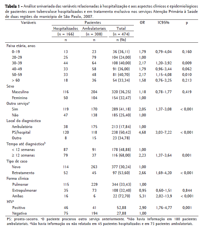 A Tabela 1 mostra associações estatisticamente significantes entre hospitalização por tuberculose e as seguintes variáveis: faixa etária 30-39 anos (OR = 2,17; IC95%: 1,20-3,92; p = 0,009), faixa etária 50-59 anos (OR = 2,17; IC95%: 1,15-4,08; p = 0,010), forma clínica pulmonar associada a extrapulmonar (OR = 5,31; IC95%: 2,02-13,9; p < 0,001), retratamento de tuberculose (OR = 2,66; IC95%: 1,69-4,20; p < 0,001), procura a outro serviço antes do diagnóstico (OR = 2,05; IC95%: 1,37-3,08; p < 0,001), tempo de sintomas maior que 12 semanas (OR = 2,23; IC95%: 1,37-3,64; p < 0,001) e diagnóstico realizado em hospital e/ou pronto socorro (OR = 4,68; IC95%: 3,03-7,22; p < 0,001).
