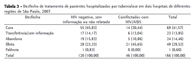 A Tabela 3 mostra o desfecho do tratamento de tuberculose para os pacientes inicialmente hospitalizados. Houve baixa proporção de cura (41,57%) e elevada proporção de óbito (29,52%). Quando são analisados os dados dos pacientes com coinfecção tuberculose/HIV previamente hospitalizados, a taxa de cura diminui para 30,44%, e a taxa de óbito aumenta para 45,65%.