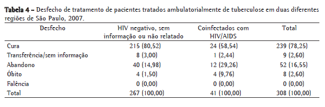 A Tabela 4 mostra o desfecho do tratamento de tuberculose para os pacientes em tratamento exclusivamente ambulatorial. Nesses, a taxa de cura foi de 78,25%, e a taxa de óbitos foi de 2,6%. No grupo de pacientes soropositivos para HIV, a taxa de cura diminuiu para 58,54%, e a taxa de óbito aumentou para 9,76%.