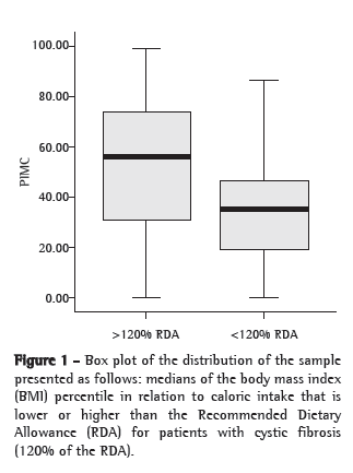 However, in the multivariate model, caloric intake was a predictive factor of height in CF patients: when adjusted for age, MRSA bacterial colonization, VEF1, number of hospitalizations and maternal level of education, greater caloric intake was associated with a lower risk of malnutrition due to height deficit. One study demonstrated a significant increase in the Z score for H/A after a nutritional intervention, through which CF patients reached a caloric intake of 132% of the RDA.(25)
