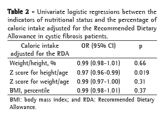 Table 2 presents the association between caloric intake and nutritional status, evaluated through the dependable variables W/H%, BMI percentile, Z score for H/A and Z score for W/A, based on the analysis of the univariate logistic regression. The indicators of nutritional status studied were dichotomized, using malnutrition cut-off points in accordance with the CF consensuses(11,12) and the World Health Organization.(13) In the crude analysis, there was a significant association between the independent variable caloric intake and the Z score for H/A outcome.