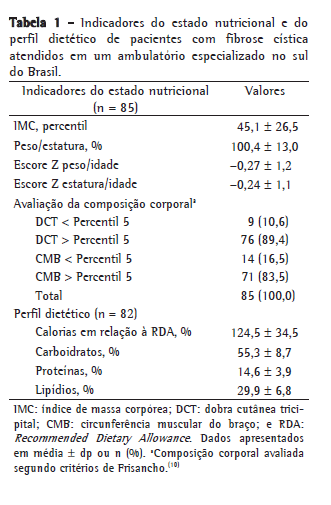 A amostra consistiu de 85 pacientes, sendo 55,3% do sexo masculino, com média de idade de 11,2 ± 3,2 anos. A idade variou entre 6,0 e 17,5 anos. Desses pacientes, 39 (45,9%) eram procedentes de Porto Alegre e de sua região metropolitana, 17 (20,0%) eram da região nordeste do estado, e os restantes pertenciam às demais regiões do estado. A insuficiência pancreática estava presente em 87,1% dos pacientes. A suplementação vitamínica era utilizada regularmente por 97,6% dos pacientes. Os suplementos nutricionais regularmente utilizados por esses pacientes eram polímeros de glicose e dieta líquida hipercalórica com 1,5 kcal/mL; 65,9% dos pacientes utilizavam um ou mais suplementos v.o., e 9,4% faziam suplementação noturna por gastrostomia.