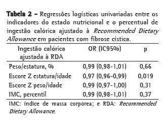 O aumento de um percentual, em relação à RDA, de ingestão calórica, diminui em 2% a chance de haver déficit de estatura (OR = 0,98; IC95%: 0,96-1,00), ajustando-se para idade, VEF1, colonização por MRSA e número de internações hospitalares (Tabela 3). A escolaridade materna parece influenciar o indicador nutricional relacionado com o crescimento, ou seja, parece haver um efeito protetor da maior escolaridade da mãe sobre o indicador nutricional relacionado ao crescimento. Entretanto, na análise multivariada, essa associação permaneceu limítrofe para a significância estatística (p = 0,054).