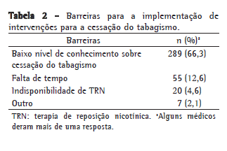 Nenhum dos médicos recomendava que os pacientes procurassem um conselheiro para a cessação do tabagismo ou um programa para cessação do tabagismo. Uma parcela significativa dos médicos - 308 (70,7%) - não marcava consulta de acompanhamento após 6-12 meses para determinar se a abstinência tabágica se mantivera, enquanto 76 médicos (17,4%) marcavam consulta de acompanhamento e 52 (11,9%) consideravam que tal consulta não era relevante para o tratamento. Os métodos relatados para a cessação do tabagismo estão descritos na Figura 1. Com relação aos obstáculos para intervenções para a cessação do tabagismo, 289 médicos (66,3%) citaram o baixo nível de conhecimento sobre o assunto, 55 (12,6%) citaram a falta de tempo, 20 (4,6%) citaram a indisponibilidade de TRN e 9 (2,1%) citaram outros motivos. Os obstáculos para a cessação do tabagismo citados pelos participantes estão descritos na Tabela 2.