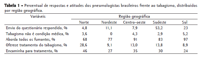 No período entre janeiro e junho de 2008, um questionário sobre a atitude frente ao tabagismo foi enviado pela internet a todos os médicos inscritos e adimplentes na Sociedade Brasileira de Pneumologia e Tisiologia (SBPT). O questionário contém 11 perguntas que abordam dados demográficos dos médicos e sua conduta diante dos pacientes fumantes. O estímulo para devolver o questionário respondido foi o sorteio de passagens e hospedagem grátis para frequentar o XXXIV Congresso Brasileiro de Pneumologia e Tisiologia, que aconteceu em novembro de 2008, na cidade de Brasília, DF. Até a data limite para a devolução do questionário pela internet, recebemos 587 questionários válidos, que correspondem a 21% do número total de pneumologistas inscritos na SBPT. Para a análise dos dados, mas não para o sorteio, foram excluídos os questionários de 15 pneumologistas pediátricos, 8 cirurgiões torácicos e 3 clínicos gerais. A distribuição, por região do país, dos questionários respondidos, bem como as respostas a perguntas sobre atitudes frente ao tabagismo, podem ser observadas na Tabela 1.