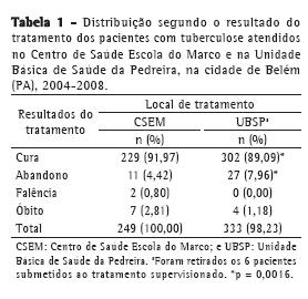Objective: To analyze the treatment strategies that influence the effectiveness of tuberculosis treatment at primary care clinics (PCCs) in Brazil. Methods: This was a descriptive, retrospective epidemiological survey based on the medical records of 588 tuberculosis patients enrolled in the tuberculosis control programs at two PCCs located in the city of Belém, Brazil: Centro de Saúde Escola do Marco (CSEM) and Unidade Básica de Saúde da Pedreira (UBSP). The survey was limited to patients enrolled between January of 2004 and December of 2008. We included only patients between 18 and 59 years of age, and we excluded those who were transferred or were found to have been misdiagnosed. We collected data regarding age, gender, type of treatment (self-administered or supervised), co-infection with HIV, and treatment outcome. The health professionals involved in the tuberculosis control program at the two PCCs were interviewed regarding the strategies used for tuberculosis control and regarding routine clinical care for tuberculosis patients. Results: There were no significant differences between the CSEM and UBSP patients regarding age, gender, or co-infection with HIV. Supervised treatment was used significantly more frequently and the rate of cure was higher at the CSEM than at the UBSP, whereas the rate of treatment noncompliance was higher at the UBSP than at the CSEM. Conclusions: For patients enrolled in tuberculosis control programs at PCCs in Brazil, supervised treatment appears to be an extremely important strategy for reducing the rate of treatment noncompliance.