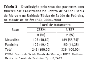 No período de estudo, 638 e 464 pacientes, respectivamente, foram diagnosticados com tuberculose no CSEM e na UBSP, dos quais foram selecionados os prontuários de todos os pacientes que se enquadravam nos critérios de inclusão e exclusão. Portanto, foram selecionados 588 pacientes, sendo 249 no CSEM e 339 na UBSP.