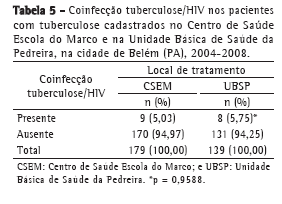 Sobre essa verificação da associação tuberculose/HIV, ressalta-se que houve menor verificação na UBSP do que no CSEM, fato esse que se configura como uma importante diferença entre as unidades, uma vez que as medidas de prevenção e controle do HIV e da tuberculose não podem ser pensadas separadamente. A coinfecção tuberculose/HIV deve ser identificada no início do tratamento para que procedimentos de acompanhamento diferenciados possam ser implementados.(20)