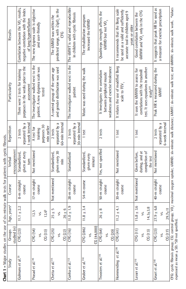 Various studies have administered the 6MWT to patients with cystic fibrosis (Chart 1), with different purposes. Recent studies(7,8) have attempted to establish reference values for the 6MWT in healthy children and adolescents. However, those studies lack consistency in terms of sample size and ethnic variability. The objective of the present study was to compare cystic fibrosis patients with healthy individuals in terms of their performance on the 6MWT, as assessed by the six-minute walk distance (6MWD).