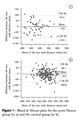 The reproducibility of the 6MWT, as assessed by the intraclass correlation coefficient, showed concordance of 0.810 (95% CI: 0.696-0.885) and 0.770 (95% CI: 0.704-0.823) in the CF group and the control group, respectively. The Bland Altman plots (Figure 1) show that the tests were very close and indicate the reliability of the measurements.