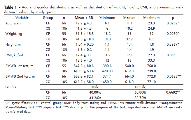 ResultsIn 2009, 168 patients were being treated at the cystic fibrosis outpatient clinic. Of those, 96 were considered eligible, in terms of age, to participate in the study. Of those 96, 41 were excluded for the following reasons: declining to participate in the study (n = 15); having pulmonary exacerbation (n = 12); missing physician visits (n = 10); and being on continuous oxygen therapy (n = 4). Therefore, the CF group comprised 55 patients, and the control group comprised 185 healthy individuals. The mean ages were 12.2 ± 4.3 years and 11.3 ± 4.3 years, respectively (overall range, 6.0-24.9 years).