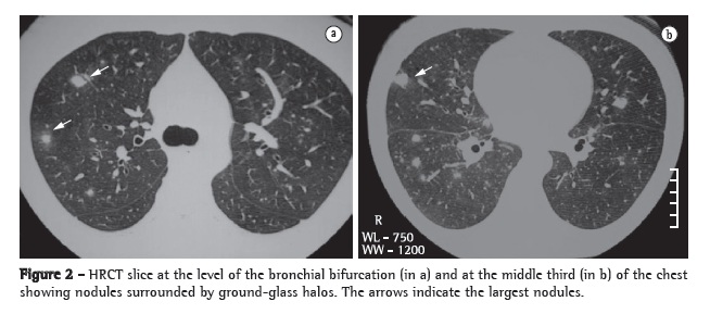 We report the case of a 16-year-old male patient who reported that, one week after having swum in a pond, he had experienced fever and epigastric pain followed by diarrhea, vomiting, and joint pain. The patient also reported that, five days before seeking medical attention, he had experienced transitory facial exanthema and dry cough. The time elapsed between the onset of the symptoms and the first medical appointment was 20 days. The results of the laboratory tests performed during his hospital stay were as follows: leukocyte count of 16,500-26,700 cells/mm3, the proportion of eosinophils ranging from 23% to 66%; and positive parasitological stool examination (PSE) results for S. mansoni eggs. Posteroanterior chest X-rays revealed various nodular opacities that had ill-defined borders and were diffusely distributed throughout the lungs. The opacities disappeared after specific treatment (Figures 1a and 1b). An HRCT scan of the chest showed the pulmonary lesions in greater detail and revealed various nodules that were diffusely distributed throughout the lung parenchyma, predominantly in the cortical regions, and measured, on average, 10.0 mm; most of the nodules showed a weak halo surrounded by ground-glass attenuation (Figure 2). The patient was treated with three 1,050-mg doses of praziquantel. At the first outpatient follow-up visit, one month after discharge, the patient was asymptomatic, and the laboratory test results were as follows: leukocyte count of 7,850 cells/mm3 (eosinophils, 17%); and positive PSE results for S. mansoni eggs. At the second outpatient follow-up visit, two months after the treatment, the leukocyte count was 6,680 cells/mm3 (eosinophils, 9%), and the PSE results were negative for S. mansoni eggs.