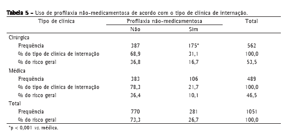 Os clínicos fizeram uso de profilaxia medicamentosa com maior frequência que os cirurgiões (p < 0,001), e os cirurgiões utilizaram meios profiláticos não medicamentosos mais intensamente que os clínicos (p < 0,001), conforme se observa nas Tabelas 4 e 5. Verificou-se ainda que em 770 internações (73,3%) não foram adotadas medidas profiláticas não-medicamentosas de qualquer natureza.
