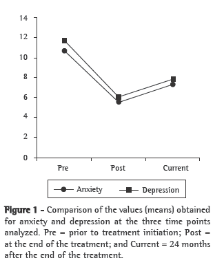 One aspect that could explain the long-term maintenance of the improvement in the indices of anxiety and depression is the fact that our team conducted weekly psychotherapy sessions after having confirmed the efficacy of such sessions in a previous study.(2) In that study, patients were randomized into three groups: Group 1, complete PRP (education, exercise, physical therapy and psychotherapy); Group 2, partial PRP (physical therapy, education and psychotherapy); and Group 3, partial PRP (physical therapy, education and exercise, without psychotherapy sessions). At the end of the treatment, the patients in all three groups presented statistically significant reductions in the level of anxiety.