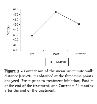 In one study,(30) the effects of pulmonary rehabilitation were evaluated using two groups. One group, after completing the treatment, received home maintenance, and the other remained without maintenance. The results obtained after 21 months demonstrated that there were no significant differences between the groups in terms of the walk test or in terms of quality of life, the results remaining above the baseline indices, despite the progressive losses. The design of the present study is similar to the design of that study. At the end of the treatment at the IME-UCS, no program maintenance was proposed. Although the rehabilitation team instructed the patients to perform activities at home, the patients were not contacted or supervised by the team after the end of the treatment.