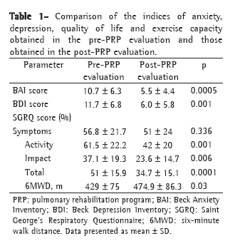 The pre-PRP evaluation revealed that 14 individuals (46.6%) had clinically significant anxiety and 15 (50%) had depression. The SGRQ scores indicated that quality of life was seriously affected in all three domains: symptoms; limitations in activities of daily living; and impact of the disease. The patients walked, on average, 428 m on the 6MWT (Table 1).