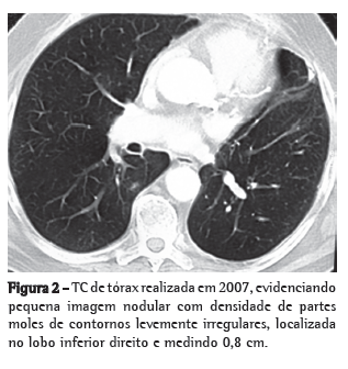 Muitas vezes na prática clínica existe o impulso de se assumir novas lesões, em pacientes com antecedente de neoplasia, como sendo recidiva tumoral, negando-lhe opções curativas e encaminhando-o para terapia com intuito paliativo. No caso de pacientes com neoplasia extrapulmonar prévia e achado de nódulo pulmonar incidental ou em exame de seguimento, a intervenção cirúrgica confirmou a presença de metástases em apenas 41,3% dos casos.(2) Em 33% dos casos, a histologia foi compatível com neoplasia primária de pulmão. A maioria dos nódulos foi abordada por videotoracoscopia. Em nosso caso, a localização do nódulo e, principalmente, seu tamanho (menor do que 1 cm) não se mostravam favoráveis para essa via.