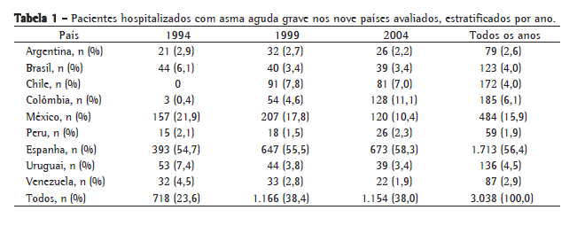 A asma é uma das doenças crônicas mais comuns em todo o mundo.(1) Nos Estados Unidos, ela é responsável por mais de 1,5 milhão de visitas ao pronto-socorro, por aproximadamente 500.000 hospitalizações e por quase 5.000 mortes por ano.(2) Na última década, houve vários avanços no diagnóstico e tratamento da asma. A ênfase mudou para a educação do paciente, as medidas objetivas do grau de obstrução brônquica e o uso de corticosteroides inalatórios para a prevenção das exacerbações.(3) Apesar desses avanços, muitos autores relatam subutilização de corticosteroides inalatórios e avaliação inadequada da obstrução das vias aéreas.(4) Entretanto, há poucos estudos avaliando as mudanças no gerenciamento da asma ao longo do tempo. Em geral, tais estudos avaliam casos ao longo de curtos períodos de tempo e são limitados em seu escopo: são realizados em serviços individuais, limitam-se a um pequeno número de serviços ou restringem-se a zonas urbanas prescritas.(5-8) Em virtude dessa falta de informação, realizamos um estudo para avaliar as modificações nas características de pacientes hospitalizados com asma aguda grave ao longo de um período de dez anos (1994-2004) na Espanha e em oito países da América Latina.