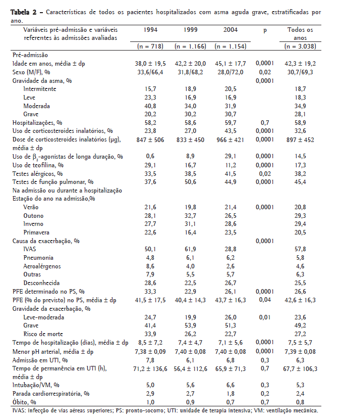 Observou-se que a maioria das hospitalizações ocorreu durante o outono e o inverno. Ao longo do estudo, houve um aumento significativo da frequência de infecções de vias aéreas superiores, bem como uma diminuição do número de casos nos quais a crise de asma havia sido desencadeada por aeroalérgenos. Além disso, a proporção de pacientes com exacerbações graves aumentou significativamente, embora tenha havido uma diminuição do número de crises com risco de morte. A média do menor pH arterial na admissão também aumentou significativamente nos anos avaliados. Além do mais, observou-se que a proporção de casos submetidos ao PFE no pronto-socorro diminuiu significativamente (de 33,3% em 1994 para 26,1% em 2004, p = 0,0001). Entretanto, também houve uma diminuição significativa da média de tempo de internação hospitalar (8,5 dias em 1994, 7,4 dias em 1999 e 7,1 dias em 2004, p = 0,0001). Não houve mudanças significativas na frequência de admissões em UTI, parada cardiorrespiratória, intubação/ventilação mecânica ou óbito hospitalar, embora tenha havido uma tendência de menor mortalidade hospitalar.