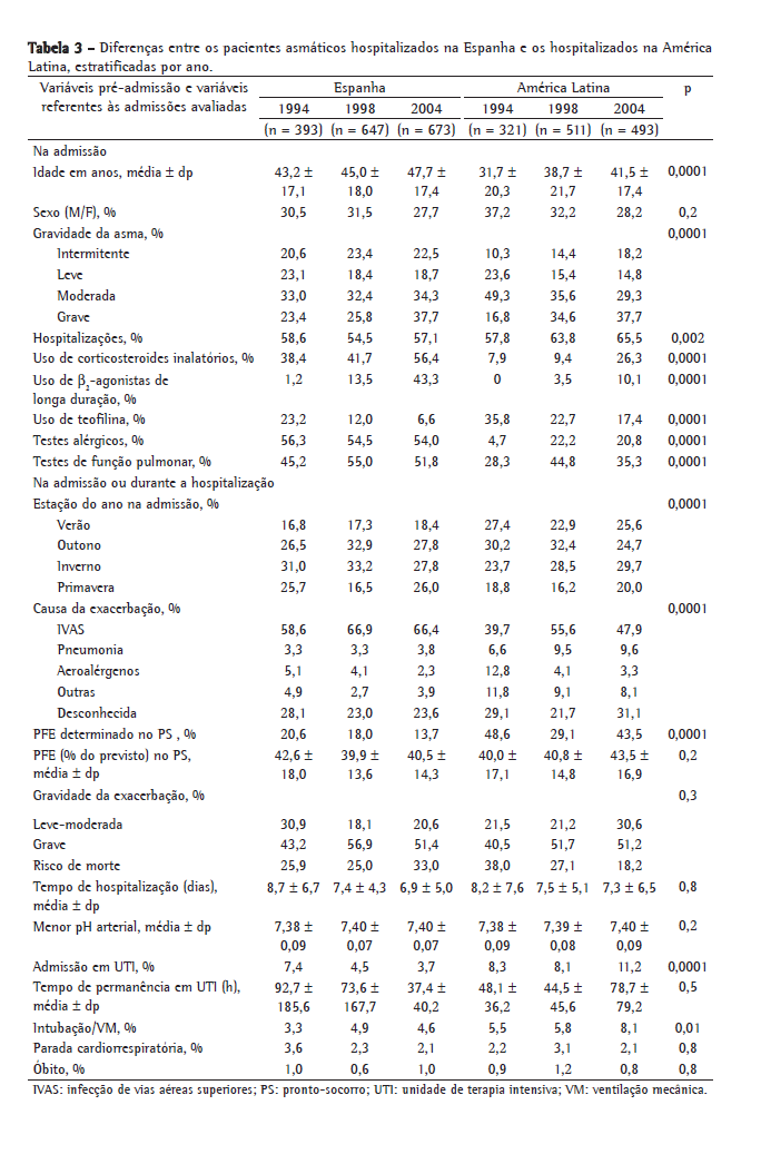 Os pacientes hospitalizados na Espanha foram submetidos a testes de função pulmonar mais frequentemente que os hospitalizados na América Latina. Ao longo do período de estudo, os pacientes hospitalizados na Espanha também apresentaram um aumento da média de menor pH arterial na admissão, uma redução significativa do tempo de internação hospitalar e uma diminuição significativa da frequência de admissões em UTI. Independentemente do grau de gravidade da asma, a proporção de pacientes que recebiam corticosteroides inalatórios foi maior entre os hospitalizados na Espanha que entre os hospitalizados na América Latina. Entretanto, não houve diferenças entre os dois grupos quanto à frequência de parada cardiorrespiratória ou à taxa de mortalidade.