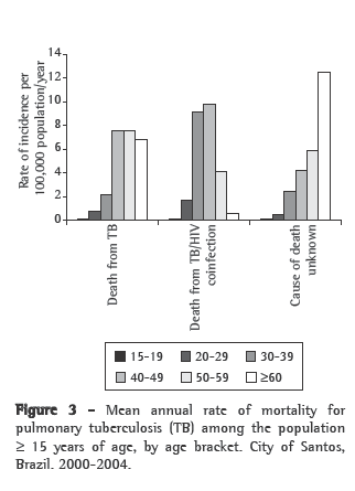 The mean annual mortality rates for TB, for TB/HIV coinfection and for cases in which there was no available information regarding the probable cause of death among those ≥ 15 years of age in the city of Santos were, respectively, 4.1, 4.2 and 4.3/100,000 population. The risk of death among those with TB/HIV coinfection was higher in the 30-49 age bracket, whereas the risk of death from TB exclusively was higher among all patients ≥ 40 years of age (Figure 3).