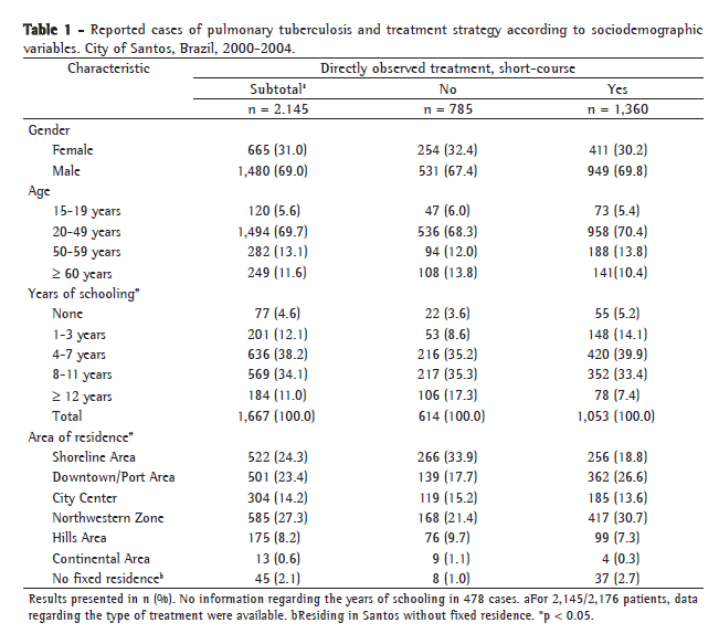 The inclusion criteria were as follows: being ≥ 15 years of age; residing in the city of Santos; presenting a clinical profile consistent with TB, the diagnosis being confirmed by sputum smear microscopy or by isolation of M. tuberculosis in culture; and chest X-ray findings suggestive of TB.