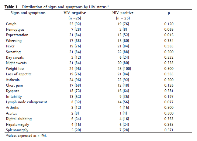Of the sample as a whole, 42 (84%) reported cough, the mean duration of the symptom being 3.0 ± 4.5 months. In addition, 9 (18%) reported hemoptysis, and 34 (68%) reported expectoration. As can be seen in Table 1, expectoration was more common among the individuals in the HIV-negative group (p = 0.016).