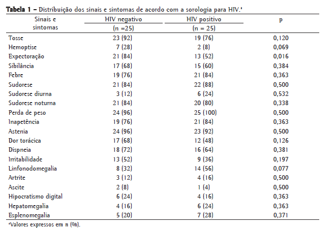 Em relação à tosse, 42 pacientes (84%) declararam possuir o sintoma, apresentando-o, em média, por 3,0 ± 4,5 meses. Além disso, 9 (18%) referiram hemoptise, e 34 (68%) referiram expectoração. A presença de expectoração foi mais frequente nos indivíduos soronegativos (p = 0,016; Tabela 1).