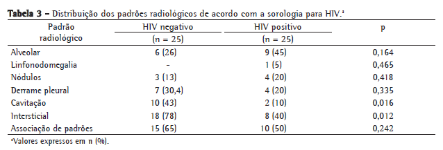 Foram avaliados os laudos das radiografias de tórax dos pacientes que dispunham dessas em seus prontuários, totalizando 23 indivíduos do grupo HIV negativo e 20 do grupo HIV positivo. Os padrões de cavitação e padrão intersticial foram mais frequentes em indivíduos com sorologia negativa ao HIV (p < 0,05). A distribuição dos padrões radiológicos encontra-se demonstrada na Tabela 3.