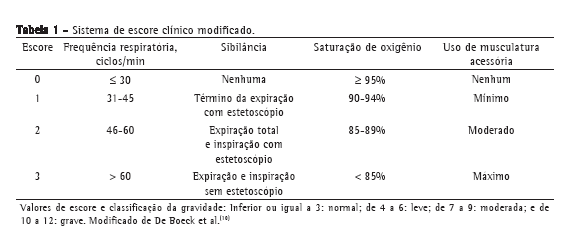 Utilizamos, para avaliar a gravidade da doença respiratória, os seguintes marcadores clínicos: sistema de escore clínico modificado de De Boeck et al.(10) (Tabela 1), tempos de oxigenoterapia e de ventilação mecânica, assim como duração da internação.