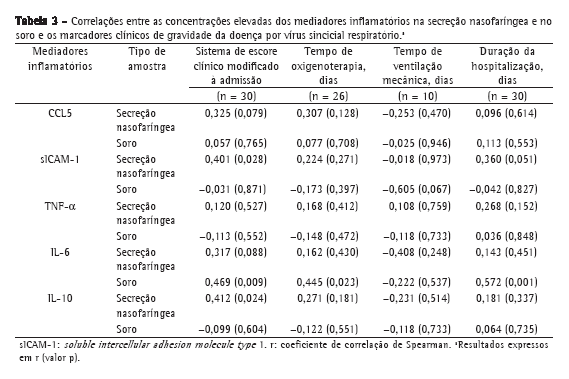 Na análise das correlações entre o sistema de escore clínico modificado, avaliado no dia da internação, e as concentrações dos mediadores inflamatórios na secreção nasofaríngea e no soro (primeiros espécimes) dos pacientes com ITRI por VSR, houve correlação positiva significante com sICAM-1 (r = 0,401; p = 0,028) e IL-10 (r = 0,412; p = 0,024) na secreção nasofaríngea e com IL-6 (r = 0,469; p = 0,009) no soro (Tabela 3).