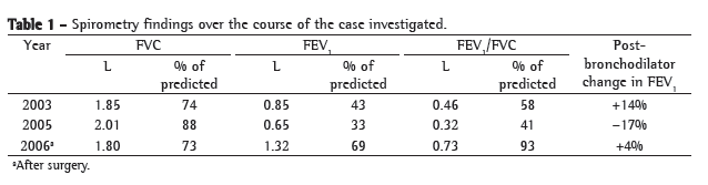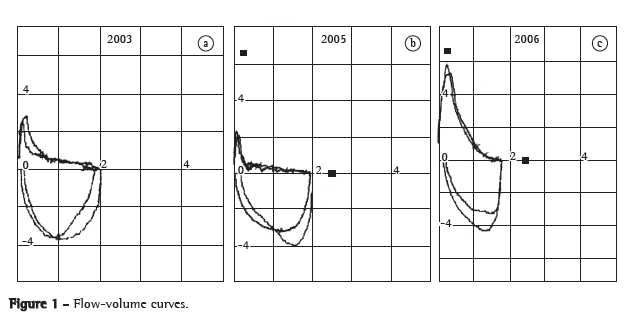 In the case presented here, the initial spirometry findings indicated moderate obstructive lung disease that was responsive to bronchodilator use (Table 1 and Figure 1a). Due to worsening of the condition of the patient, we performed a second spirometry test, which revealed obstructive lung disease that was more accentuated than in the previous test and no longer responded to the bronchodilator (Table 1 and Figure 1b).